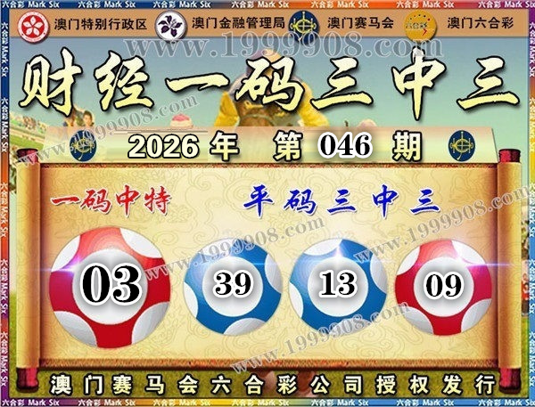 046期开奖结果:13-09-20-22-39-36 特码03